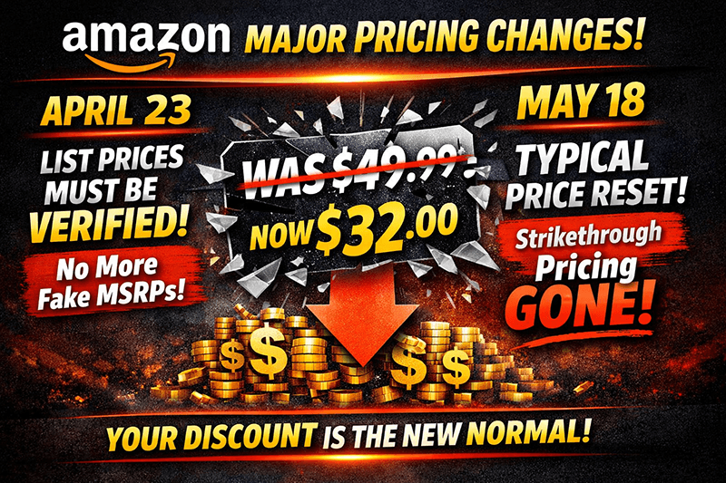 May 18: This is the big one. Amazon is changing how it calculates Typical Price (the "Was" price behind your strikethrough). If your Featured Offer price sits below the non-promotional median for more than half of the last 90 days, Amazon folds ALL sales, including promotional ones, into the calculation. Your discount becomes your new baseline. Strikethrough gone.