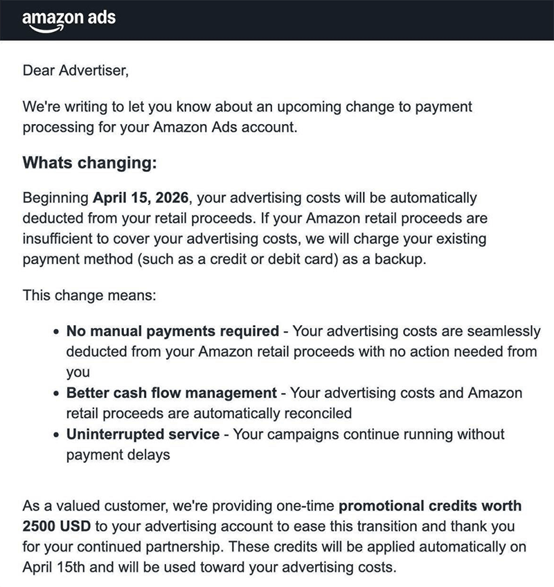 Starting April 15 (10 days from now) Amazon will automatically deduct your ad costs from your seller proceeds before you ever see a dime. Your credit card on file becomes a backup, not a payment method.