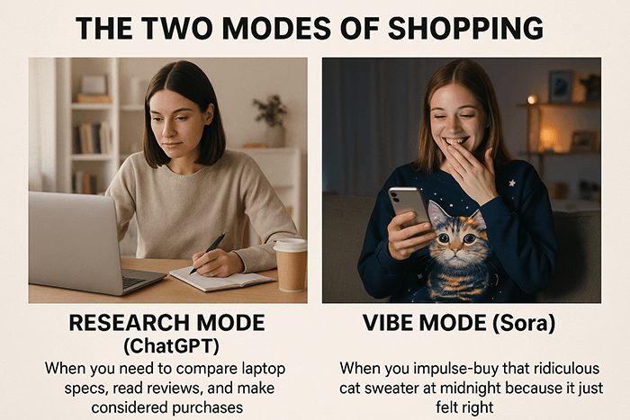 Now OpenAI has both pieces: the analytical research assistant AND the entertainment-driven discovery engine. More importantly, they control the entire journey: discovery happens in Sora's feed, and transactions happen through ChatGPT's checkout. It's a closed ecosystem that guides every type of purchase, from considered to impulsive.