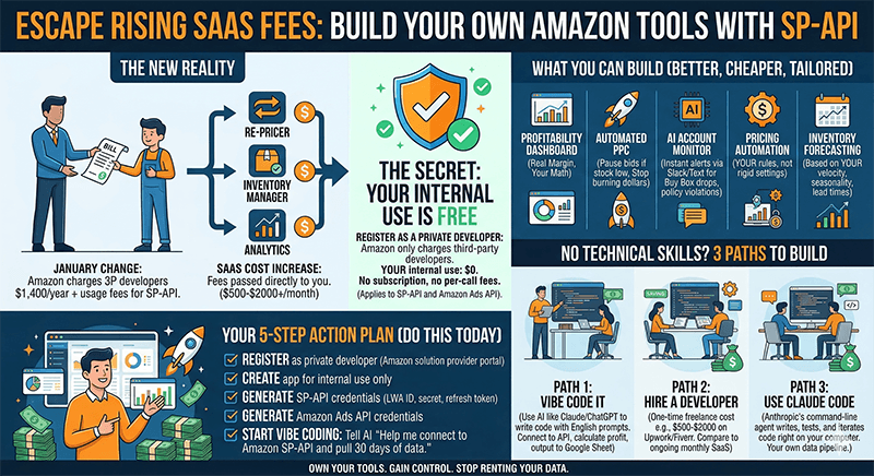 In January, Amazon changed pricing on SP-API access. Third-party developers now have to pay $1,400/year plus usage fees to pull your data through SP-API. That means every tool you use ... re-pricers, inventory managers, analytics dashboards ... got more expensive.