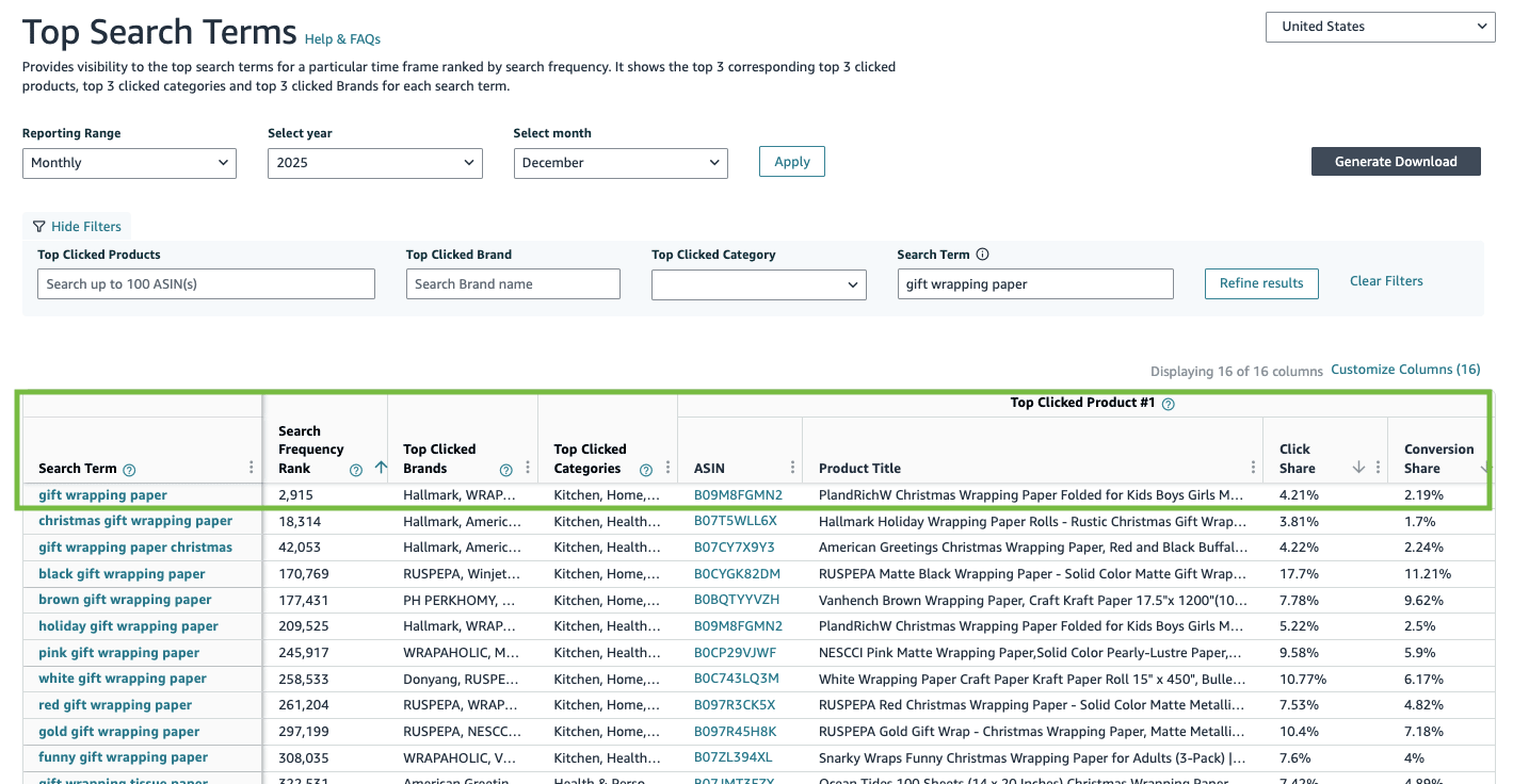 STEP 4: Go to Search Query Performance and find the Search Query Volume. "Gift wrapping paper" in this example for December 2025: 358,155 searches