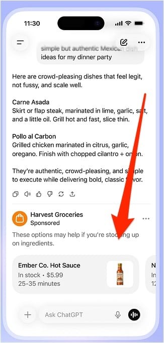 Shopping/Grocery Example: A user asks ChatGPT about authentic Mexican food ideas for a dinner party. ChatGPT responds with suggestions, then shows a sponsored product carousel at the bottom, with for example, "Ember Co. Hot Sauce" available at a nearby grocery store with 25-35 minute delivery.