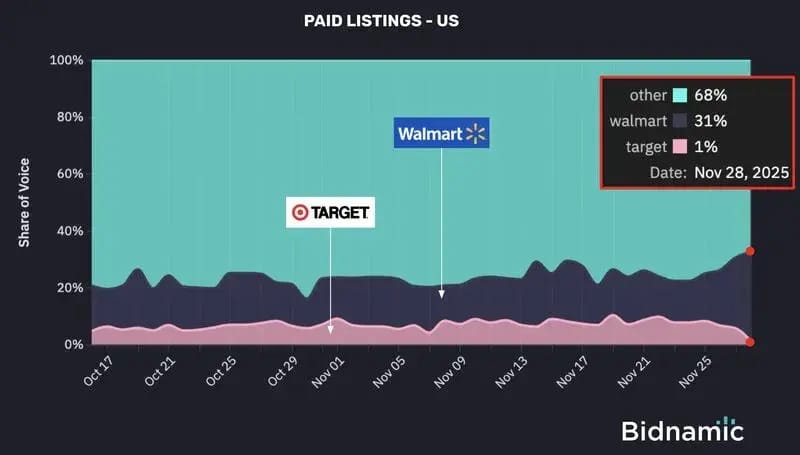 US Market: Walmart pushed visibility to 31% on Black Friday itself, a deliberate strategy to dominate when conversion rates peak and shoppers move fastest. Meanwhile, Target dropped from 8% in early November to just 1% on the day, showing they'd rather protect margin than chase expensive clicks.