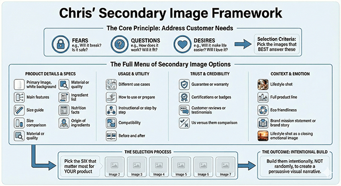 Chris shared that his team uses a standard operating procedure with more than twenty possible types of secondary images. For each product, they pick the ones that best answer customer fears, questions and desires.