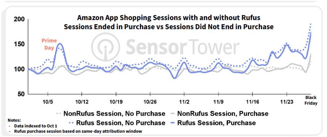 Nov 15-Black Friday: Rufus sessions surged 86% vs. baseline; non-Rufus sessions only increased 16%