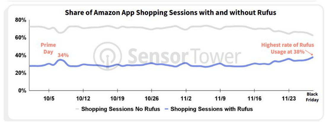 Black Friday: 38% of sessions now include Rufus (an 8-percentage-point gain)
