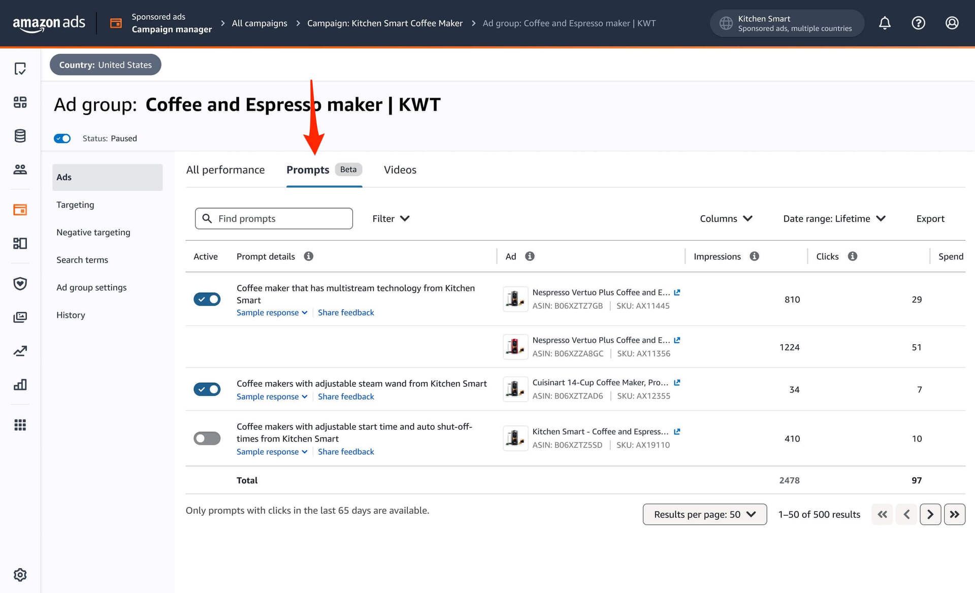 To see your prompt performance, navigate to: Campaign → Ad Group → Ads → Prompts tab