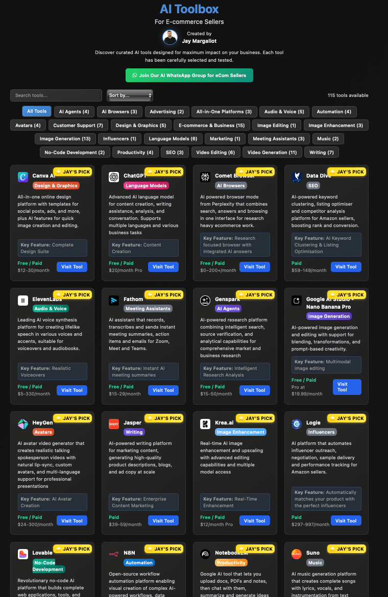 Jay Magaliot has assembled a directory of 71 AI tools ideal for e-commerce sellers. Check out his list of curated AI tools designed for maximum impact on your ecom business. Each tool has been carefully selected and tested.