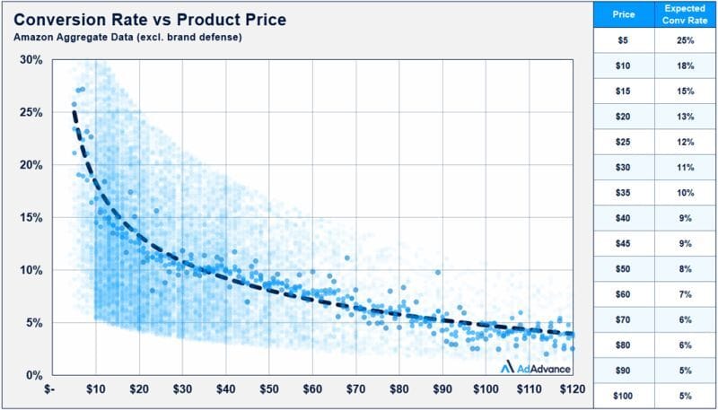 For example, he found that a $20 product on Amazon will average about a 13% conversion rate, whereas a $50 product will average an 8% conversion rate and at a $100 price point you can expect about a 5% conversion rate.